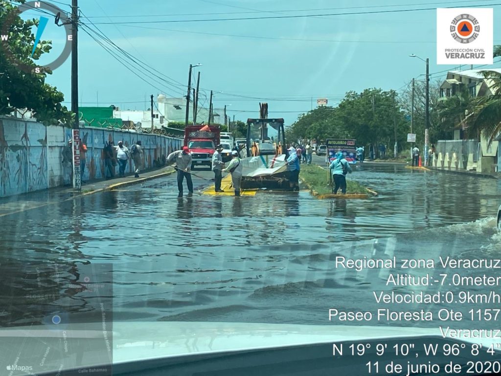 Veracruz: Se tiene reporte por anegamiento en el fraccionamiento Floresta, con tirantes entre 20 centímetros a 1 metro. Personal de Limpia Pública municipal realizó trabajos de limpieza en las partes donde ya han bajado los tirantes de agua. El cárcamo de bombeo “La Zamorana” fue dañado por un rayo y opera solo con dos bombas, por lo que Comisión Nacional del Agua y Protección Civil activaron bombas de achique móviles. Las acciones son realizadas por elementos de CONAGUA y PC estatal.