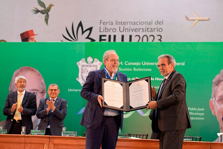 La entrega se realizó en sesión solemne del Consejo Universitario General (CUG), encabezada por Martín Aguilar Sánchez, rector de esta casa de estudios, y tuvo como sede el Foro “Miguel Vélez Arceo” de la Casa del Lago UV, en el marco de la Feria Internacional del Libro Universitario (FILU) 2023.