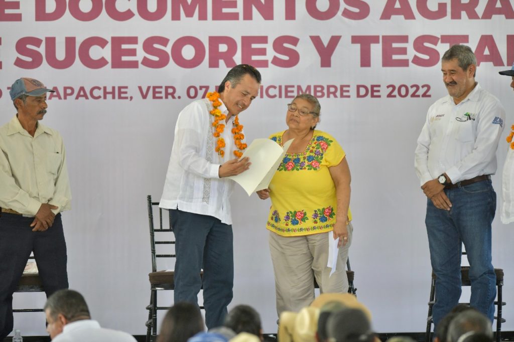 En el evento, el señor Aurelio Cruz Hernández, de 104 años de edad, recibió del Gobernador su documento agrario que hace justicia a una larga y calamitosa espera, atestiguado por el secretario de Gobierno, Eric Patrocinio Cisneros Burgos; la fiscal Verónica Hernández Giadáns; beneficiarios y autoridades del RAN, la Procuraduría Agraria y el Ayuntamiento.