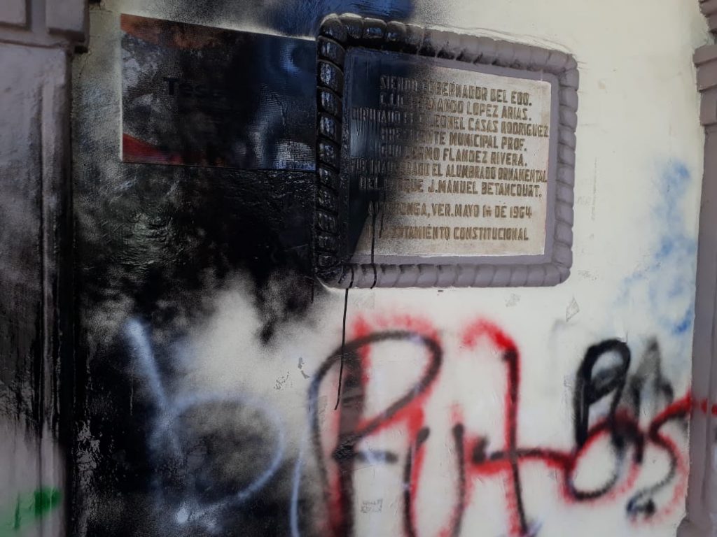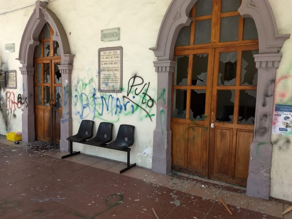 La Policía Preventiva Municipal no pudo o no quiso hacer nada para evitar que rompieran vidrios de puertas y ventanas y que hicieran pintas con pintura de aerosol.