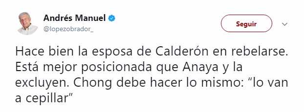 Ciudad de México.- “Hace bien la esposa de Calderón en rebelarse. Está mejor posicionada que Anaya y la excluyen. Chong debe hacer lo mismo: lo van a cepillar”, escribió en su cuenta de Twitter el dirigente nacional de Morena, Andrés Manuel López Obrador.