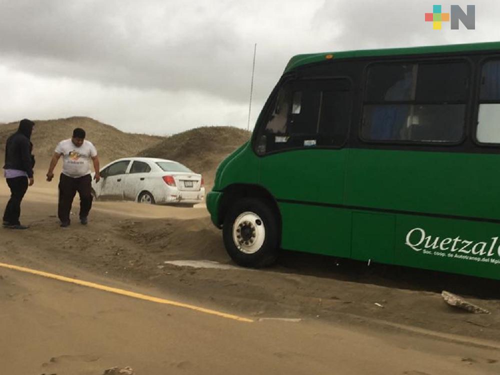 Coatzacoalcos, Ver.- El fuerte viento registrado en Coatzacoalcos provocó que casi una decena de vehículos quedaran atrapados por la arena que invadió la sexta etapa del malecón costero.