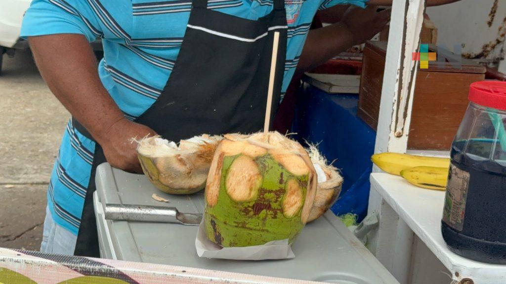 El coco se ha mantenido en el precio de entre 40 a 50 pesos, no sólo se sirve por el agua, también por la carne que luego es preparada al gusto por los visitantes.