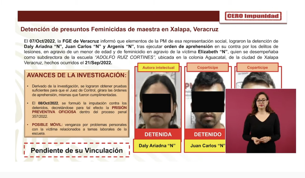 Luego de ser detenidos Daly Ariadna “N”, Juan Carlos “N” y Argenis “N”, presuntos asesinos de Elizabeth “N”, subdirectora del plantel educativo “Adolfo Ruiz Cortines”, fueron imputados, imponiéndoles un juez medida cautelar de prisión preventiva oficiosa por un año, dentro del proceso penal 357/2022.