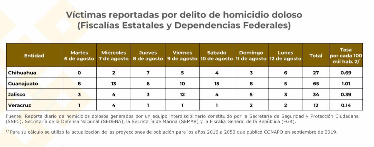 Como cada martes en la COESCONPAZ se evalúan las cifras de la incidencia de homicidio doloso, en la cual nuestro estado sigue muy por debajo en comparación con los estados donde gobierna la oposición, como Jalisco, Guanajuato y Chihuahua, tal como se muestra en la tabla:
