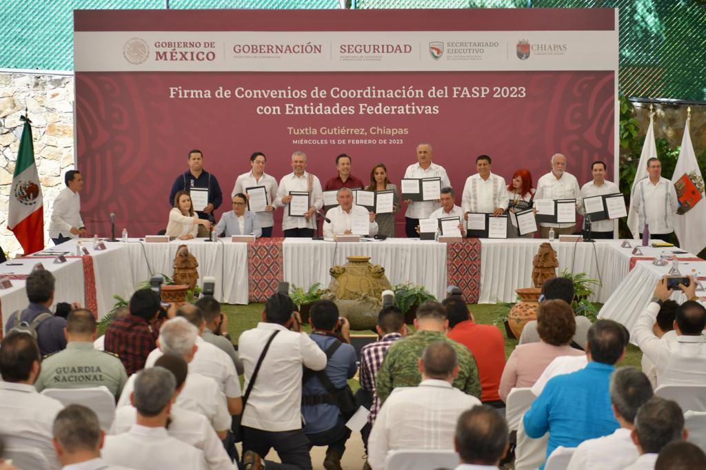 Tuxtla Gutiérrez, Chis.- El gobernador Cuitláhuac García Jiménez firmó el Convenio de Coordinación del Fondo de Aportaciones para la Seguridad Pública (FASP) 2023 con Entidades Federativas, del cual corresponden 302 millones de pesos a Veracruz a efecto de mejorar sus indicadores y lograr la paz social.