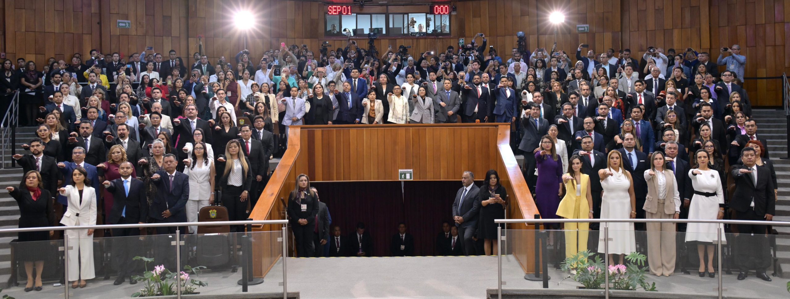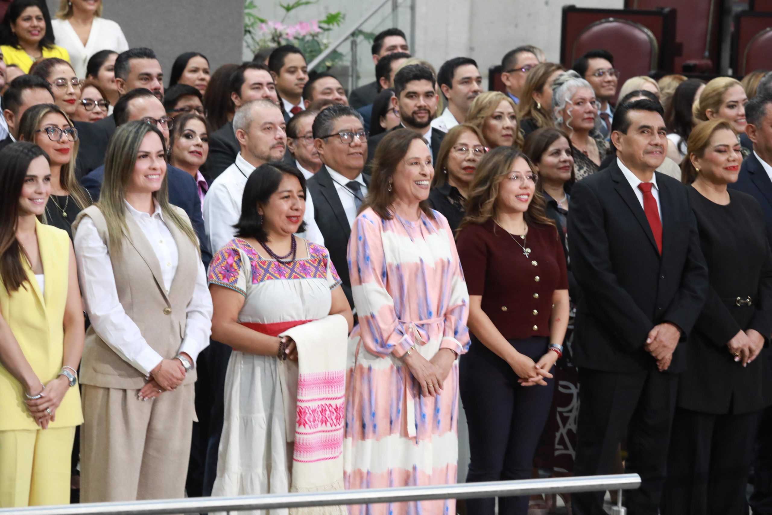 Xalapa, Ver.- En un ambiente de respeto entre los Poderes del Estado, la gobernadora Rocío Nahle García participó en la Sesión Solemne de la LXVII Legislatura para la toma de protesta de 98 magistradas, magistrados, juezas y jueces del Tribunal Superior de Justicia.