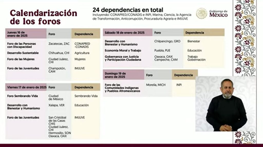 En la Mañanera del Pueblo, el coordinador de asesores de la Presidencia de la República, Jesús Ramírez Cuevas, informó el calendario y las temáticas que del 6 al 17 de enero habrán de desarrollarse en todo el país para integrar el documento que posteriormente se discutirá y analizará.