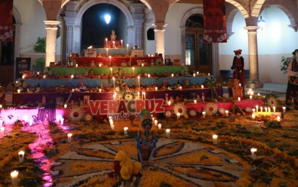 El acto continuó con el corte de listón del Altar Monumental de Veracruz, instalado en el Palacio de Gobierno bajo la dirección del artista Joaquín Miranda Portillo; está dividida en dos secciones —una prehispánica y otra de la región Capital— elaboradas con semillas y elementos naturales que evocan los cuatro elementos: tierra, agua, aire y fuego, así como los siete niveles que el alma recorre hacia el Mictlán.