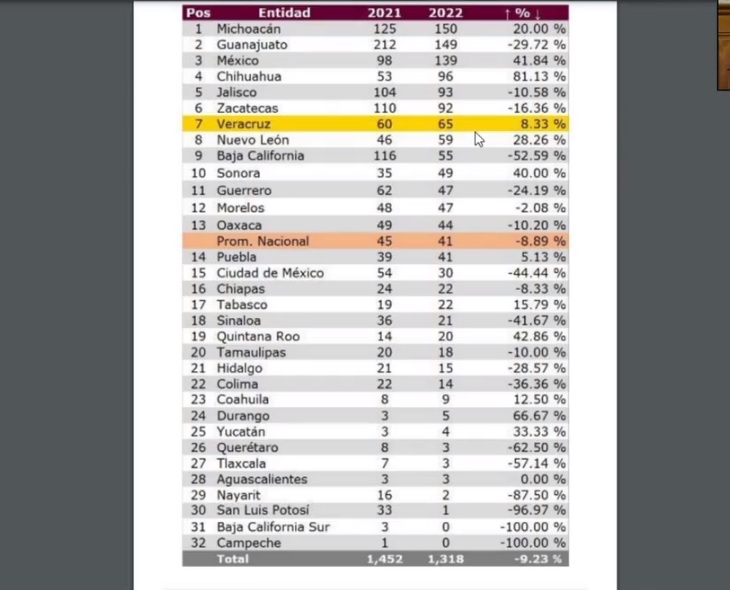 En relación a las Víctimas de homicidio doloso por cada 100 mil habitantes en diciembre de 2021, Veracruz está al 1.2 por ciento, ubicado en el lugar 17 de los 32 estado, y por debajo de la media nacional que es de 2.0 por ciento.