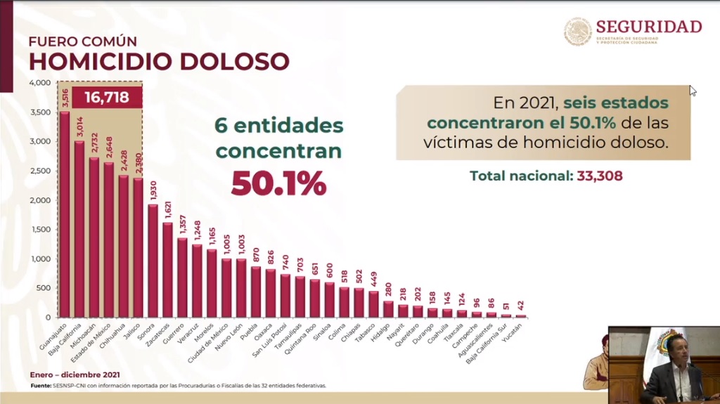 Al final del 2021, en relación al homicidio doloso, se puede apreciar que ya no está dentro de los primeros estados con mayor concentración de este delito, al ocupar el lugar 10 con mil 250 capas, en comparación a Guanajuato y Baja California que concentran hasta 3 mil.