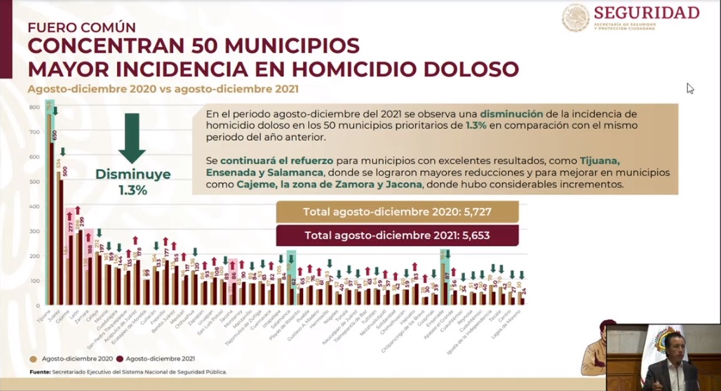 Otro dato importante, expuso el Gobernador, es que dentro de los 50 municipios que concentran la mayor incidencia en homicidio doloso, no hay ninguno de la entidad.