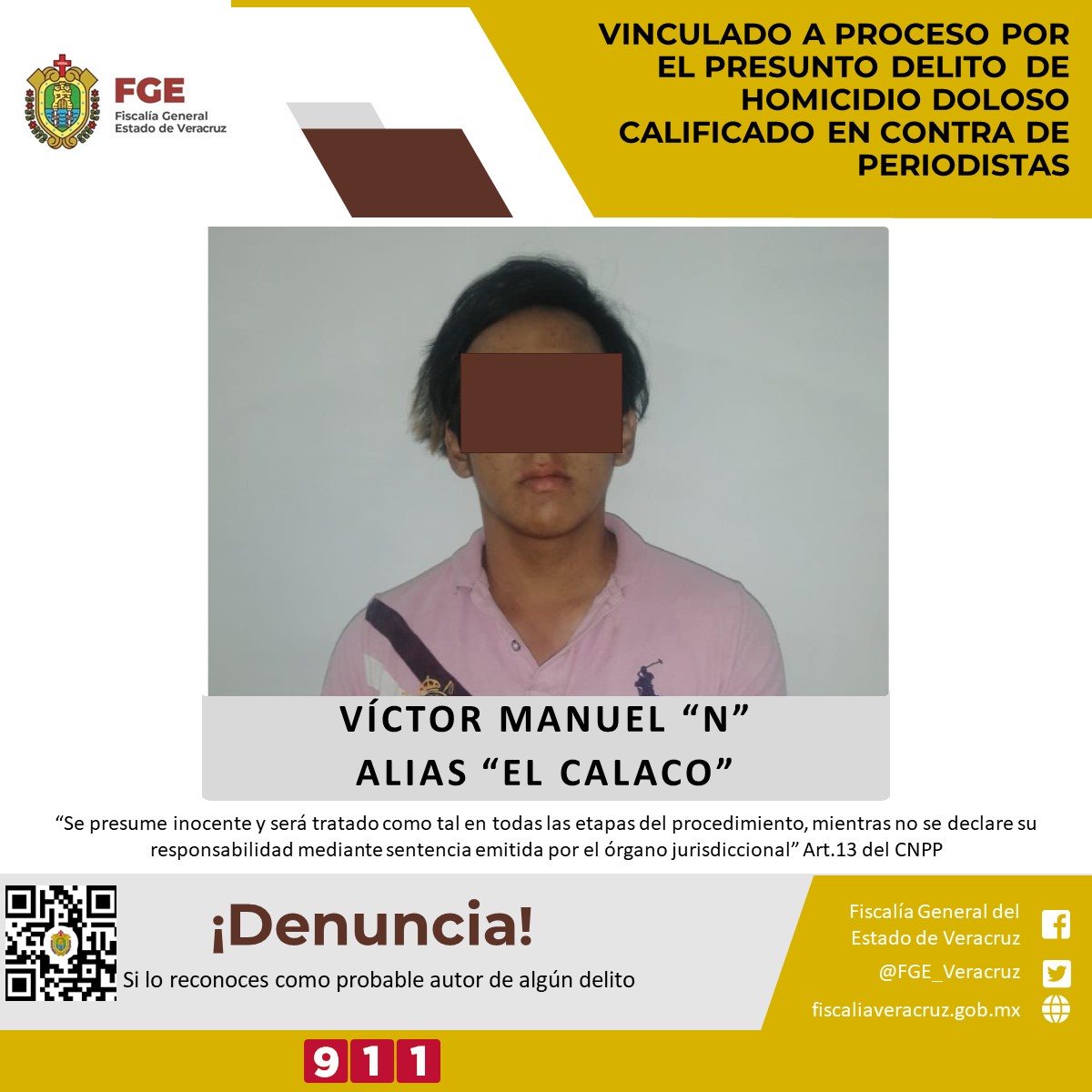 Xalapa, Ver.- La Fiscalía General del Estado informa que a través de la Fiscalía Regional Coatzacoalcos, obtuvo vinculación a proceso en contra de Víctor Manuel “N”, alias “El Calaco”, por el presunto delito de homicidio doloso calificado cometido en agravio de la directora del portal El Veraz, Yessenia Mollinedo Falconi y la reportera Sheila Johana García Olivera, hechos suscitados el pasado 9 de mayo del presente año en el municipio de Cosoleacaque.