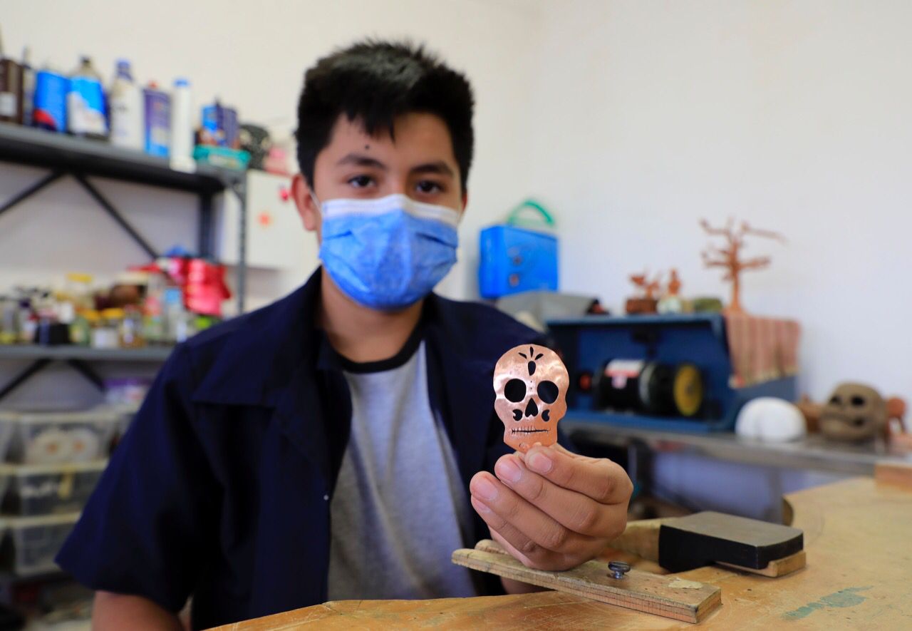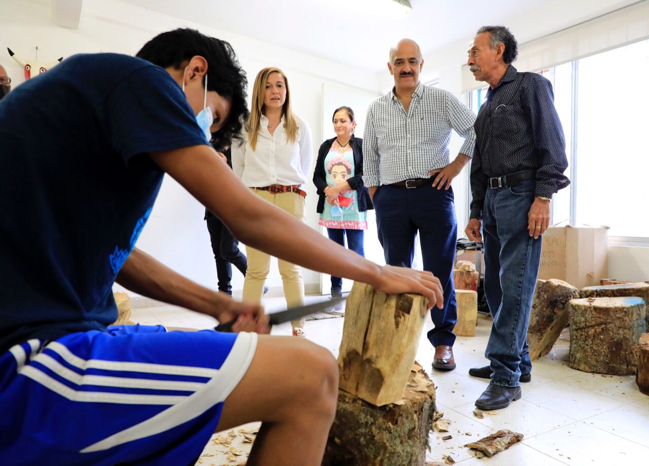 Acompañado por la directora de Cultura, Karla Montano Rocher, el Alcalde conoció la labor que maestros, niñas y niños realizan en los talleres gratuitos de alfarería, orfebrería, talla de madera y cartonería. Ahí, se elaboran desde instrumentos musicales hasta máscaras de madera y barro; también calaveras, piñatas, alcancías en forma de animales, jarrones y alhajeros, entre otras manualidades y artesanías.
