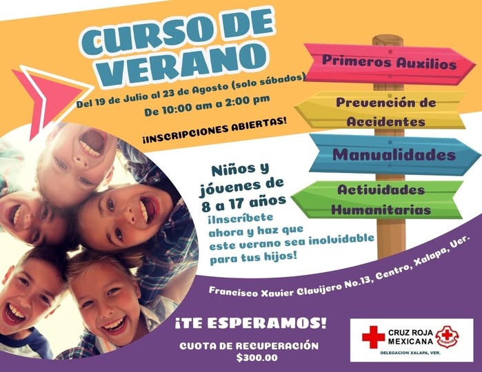 La Cruz Roja delegación Xalapa invita a un curso de verano sabatino del 19 de julio al 23 de agosto, abordarán temas como primeros auxilios, prevención de accidentes, manualidades y actividades humanitarias.