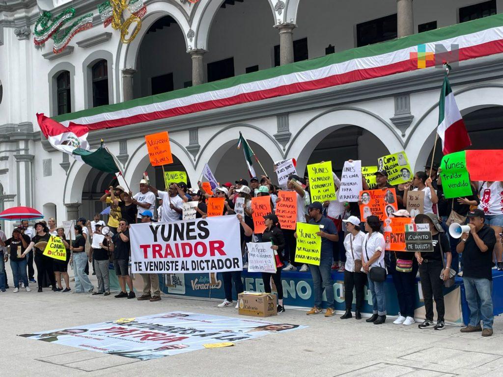 Con cartulinas y lonas, hicieron señalamientos contra el senador panista Miguel Ángel Yunes Márquez quien votó a favor de la reforma judicial.